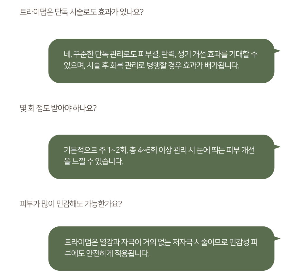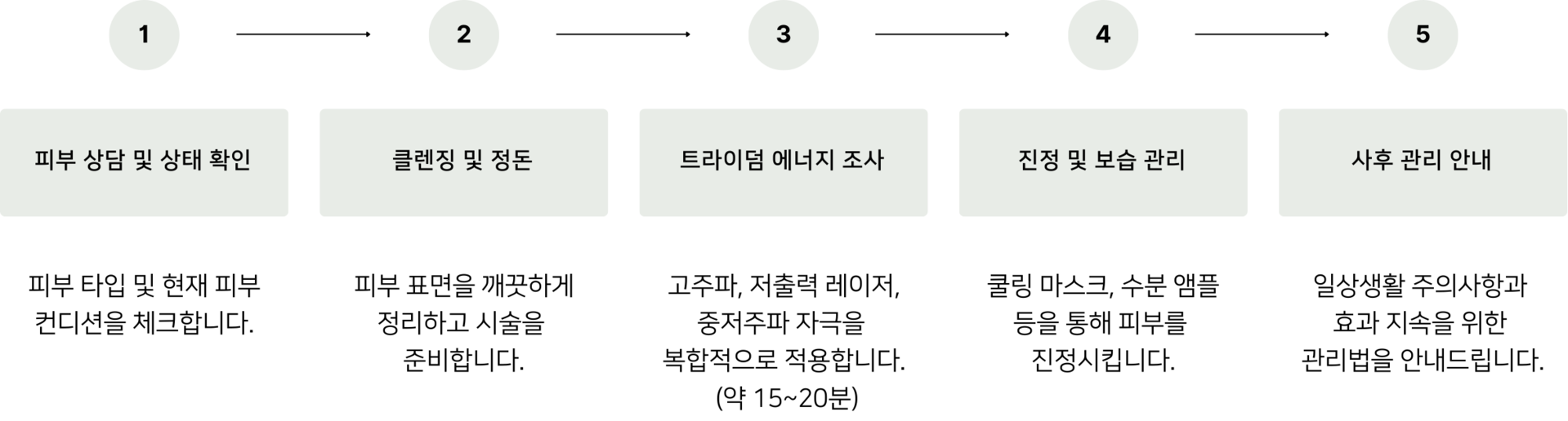 트라이덤은 고주파(RF), 저출력 레이저(LLLT), 중저주파 전류를 한 번에 사용하는 3중 복합 에너지 치료로,